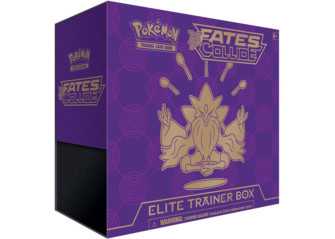 • 8 Pokémon TCG: XY—Fates Collide booster packs • 65 Card sleeves featuring Mega Alakazam • 45 Pokémon TCG Energy cards • A player's guide to the XY—Fates Collide expansion • 6 Damage-counter dice • 1 Competition-legal coin-flip die • 2 Acrylic condition markers • A collector's box to hold everything, with 4 dividers to keep it organized • A code card for the Pokémon Trading Card Game Online